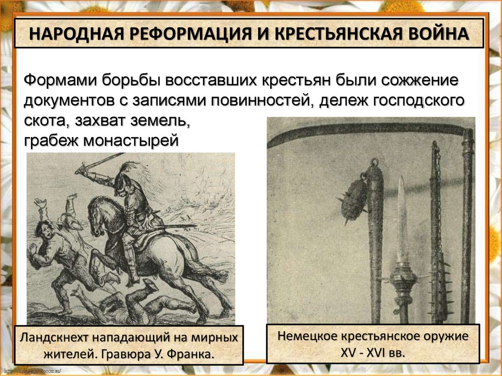 НАРОДНАЯ РЕФОРМАЦИЯ И КРЕСТЬЯНСКАЯ ВОЙНАФормами борьбы восставших крестьян были сожжение