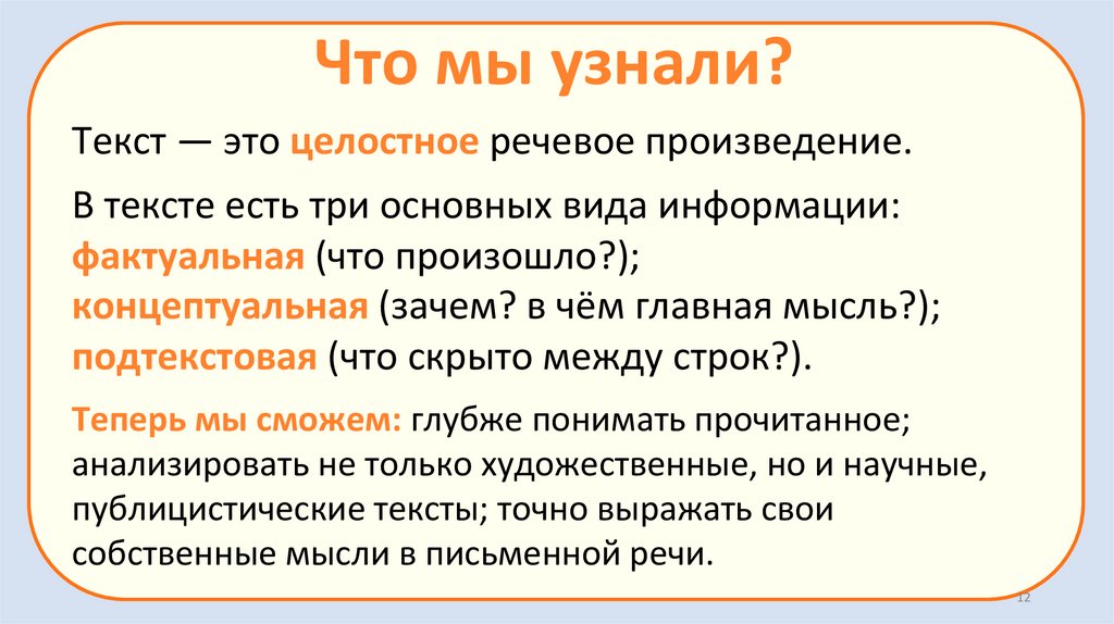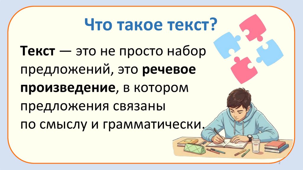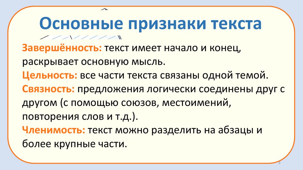 Основные признаки текстаЗавершённость: текст имеет начало и конец,