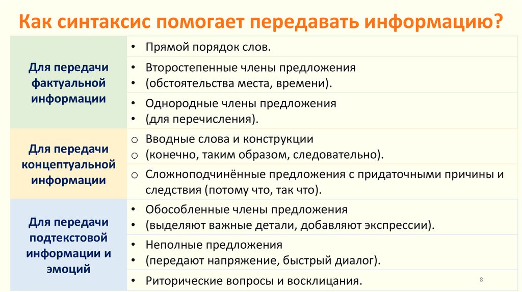 Как синтаксис помогает передавать информацию?• Прямой порядок слов.