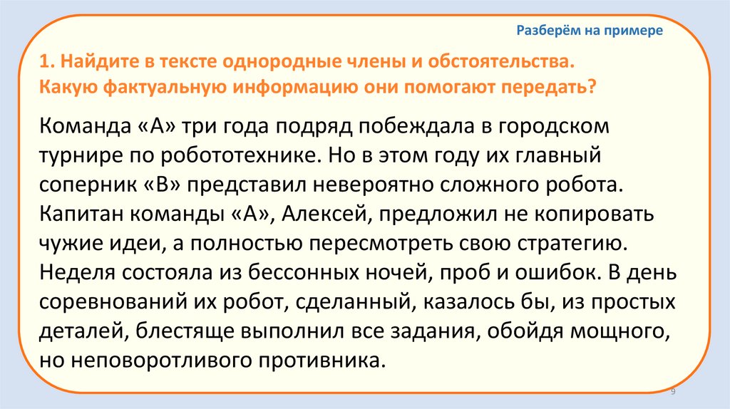 Разберём на примере1. Найдите в тексте однородные члены и обстоятельства.