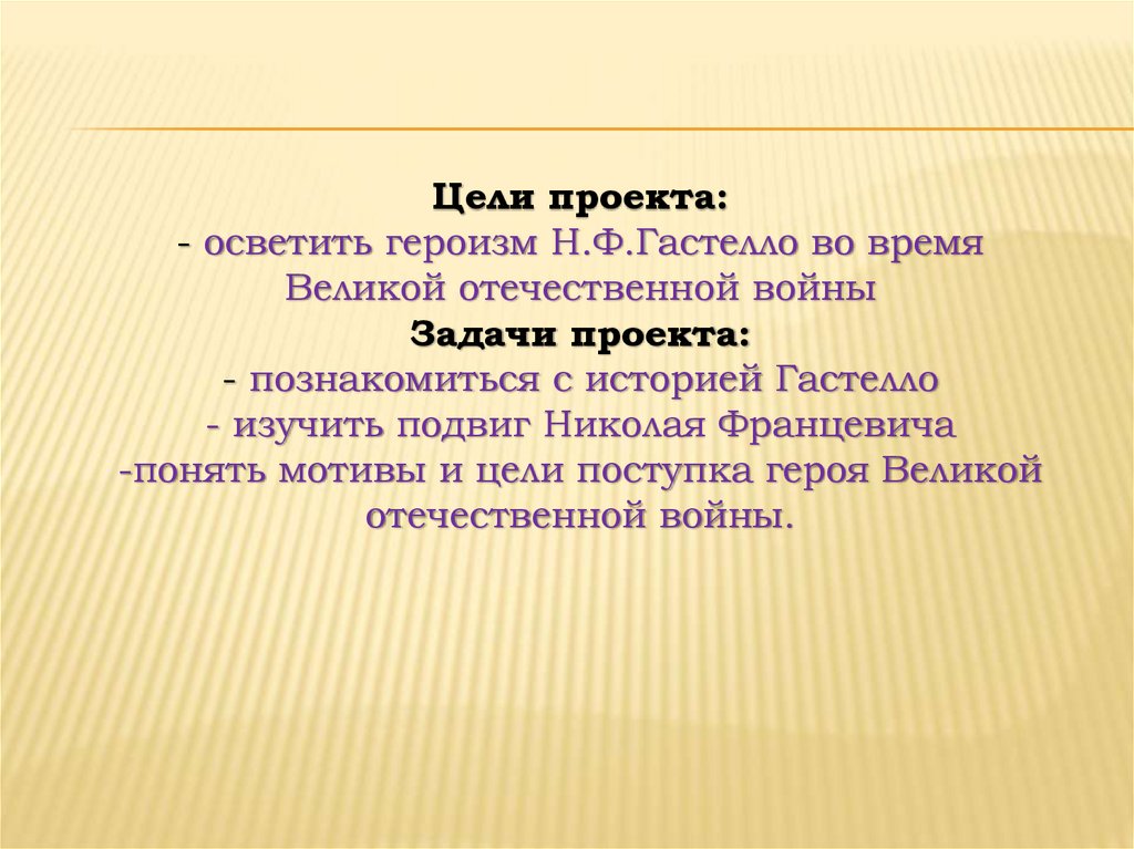 Цели проекта:- осветить героизм Н.Ф.Гастелло во время