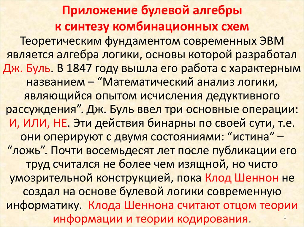 1. Приложение булевой алгебры к синтезу комбинационных схем