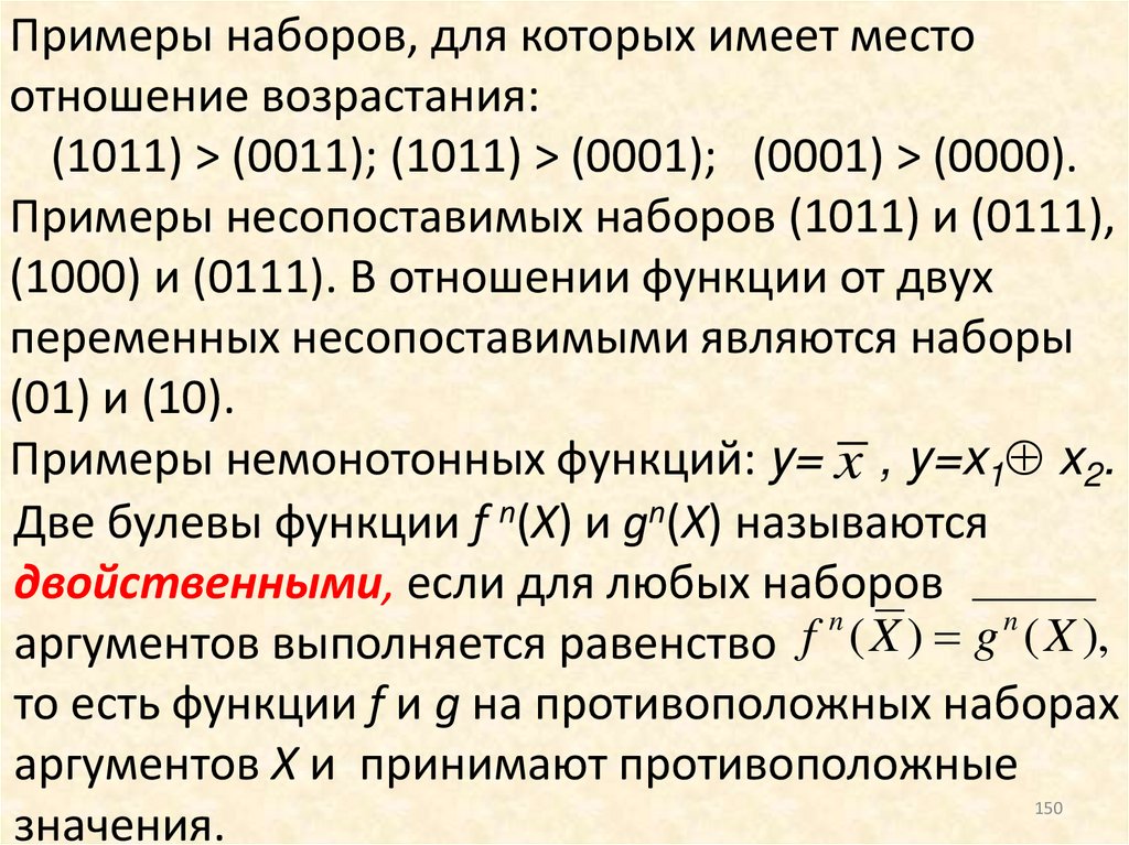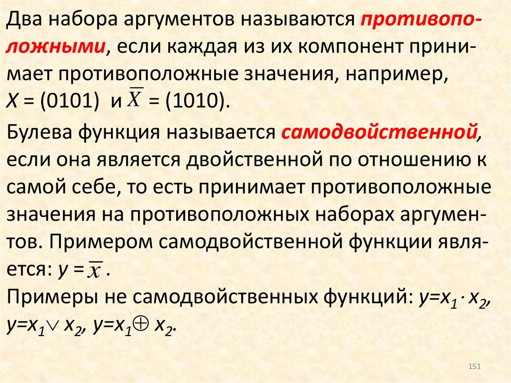 Два набора аргументов называются противоположными, если каждая из их компонент принимает противоположные значения, например,Х = (0101) и X = (1010).