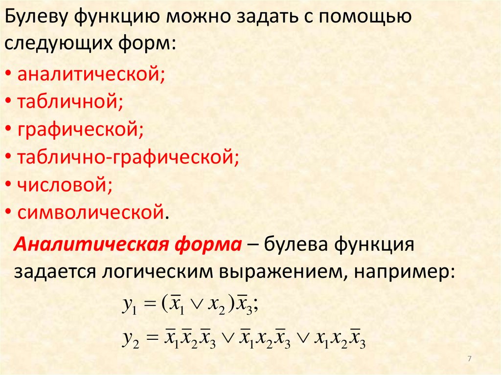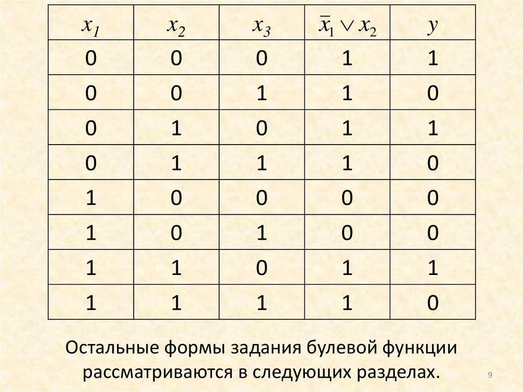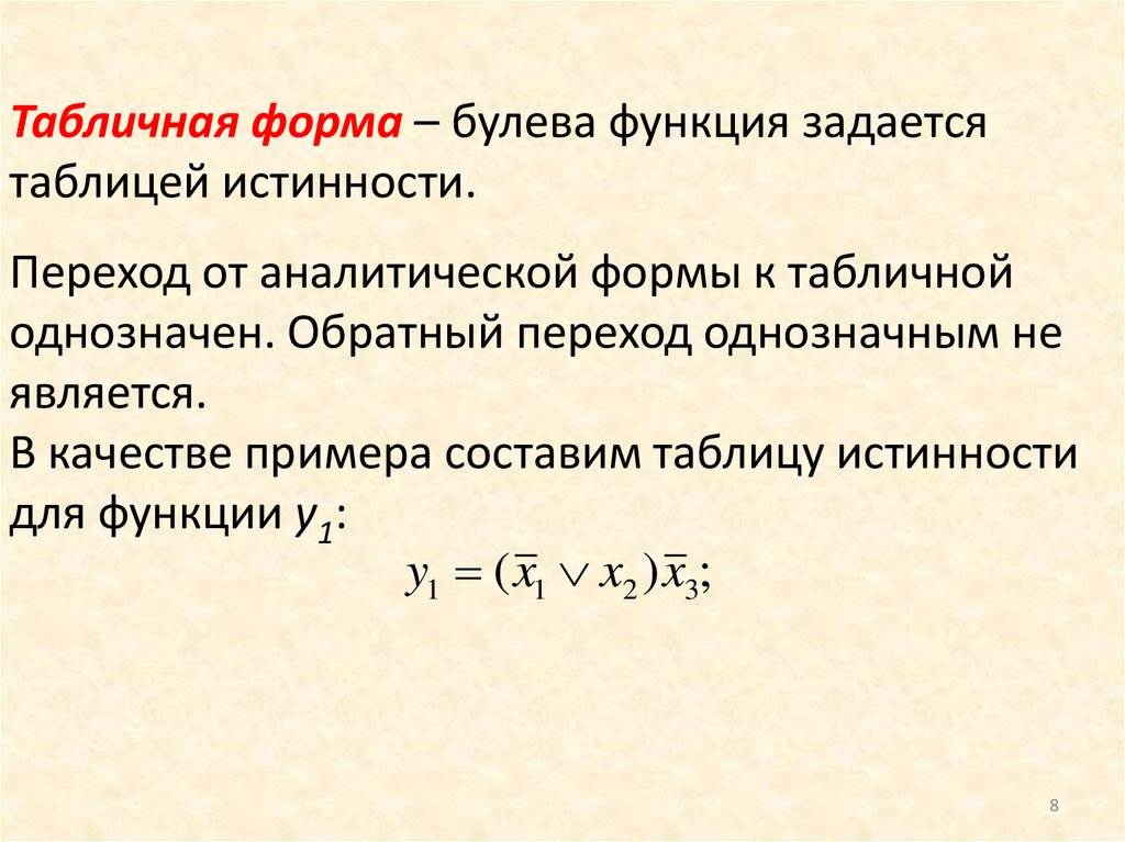 Табличная форма – булева функция задаетсятаблицей истинности.