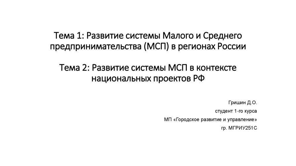 Тема 1: Развитие системы Малого и Среднегопредпринимательства (МСП) в регионах России