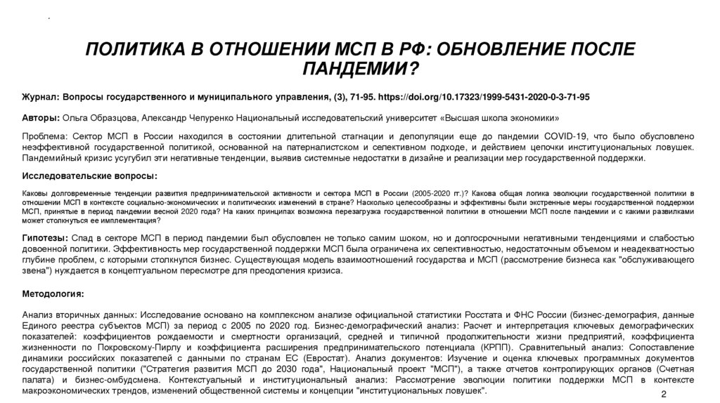 МСП, принятые в период пандемии весной 2020 года? На каких принципах возможна перезагрузка государственной политики в отношении МСП после пандемии и с какими развилками