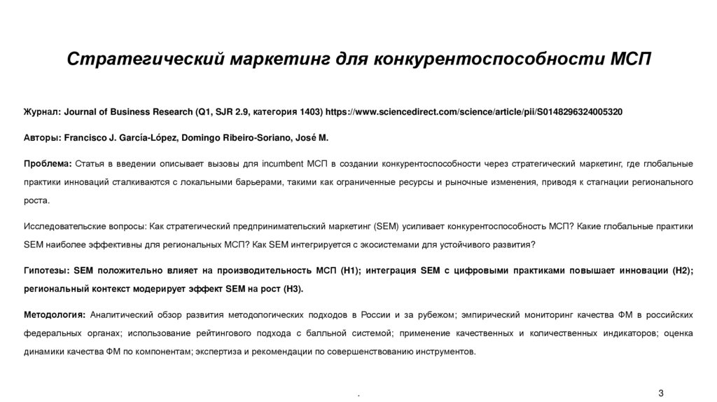 Стратегический маркетинг для конкурентоспособности МСПЖурнал: Journal of Business Research (Q1, SJR 2.9, категория 1403) https://www.sciencedirect.com/science/article/pii/S0148296324005320