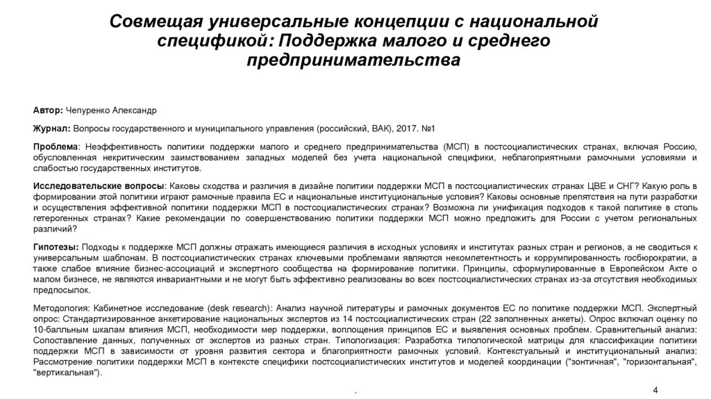 Совмещая универсальные концепции с национальнойспецификой: Поддержка малого и среднего