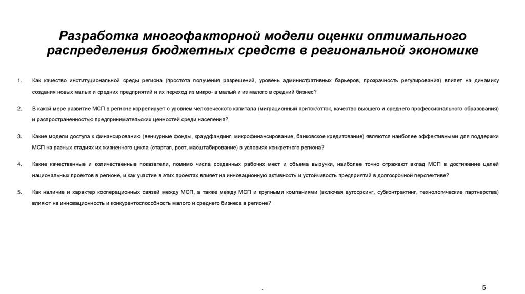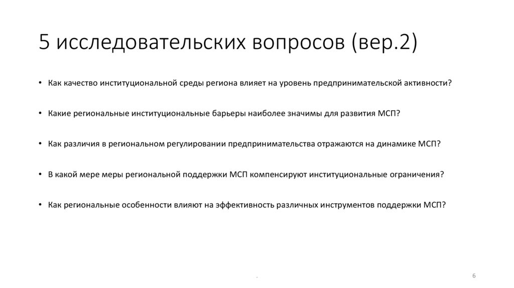 5 исследовательских вопросов (вер.2)• Как качество институциональной среды региона влияет на уровень предпринимательской активности?