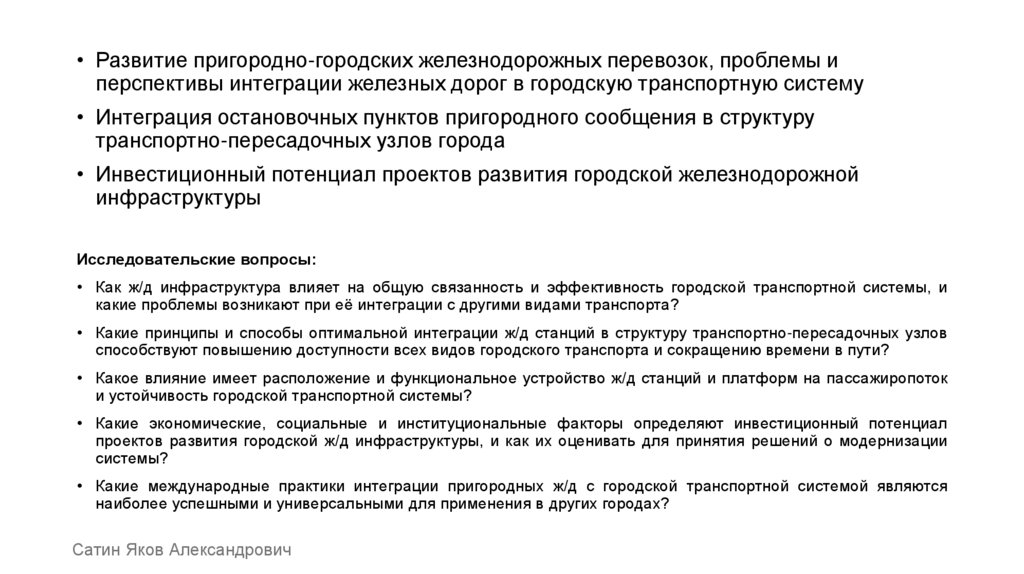 • Развитие пригородно-городских железнодорожных перевозок, проблемы иперспективы интеграции железных дорог в городскую транспортную систему