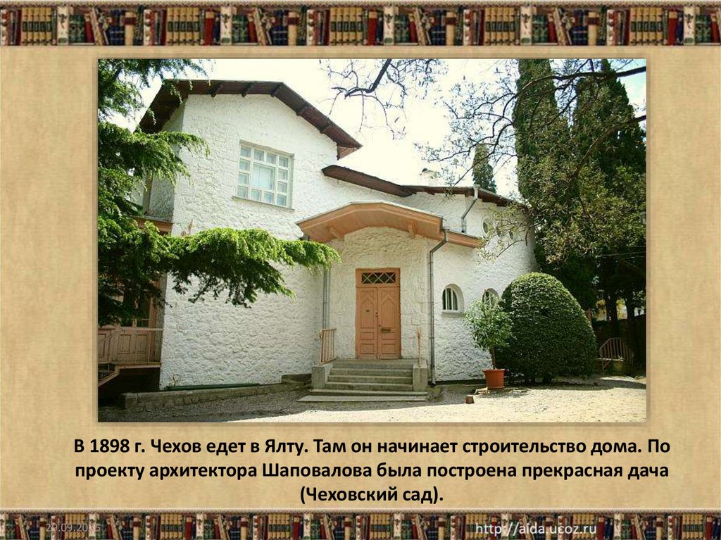 В 1898 г. Чехов едет в Ялту. Там он начинает строительство дома. Попроекту архитектора Шаповалова была построена прекрасная дача