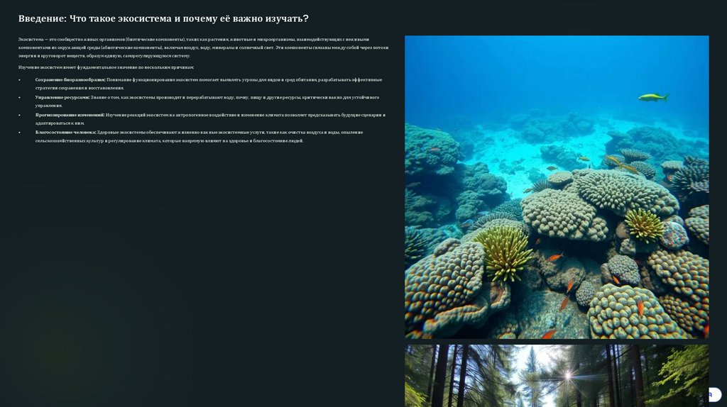 Введение: Что такое экосистема и почему её важно изучать?Экосистема — это сообщество живых организмов (биотические компоненты), таких как растения, животные и микроорганизмы, взаимодействующих с неживыми