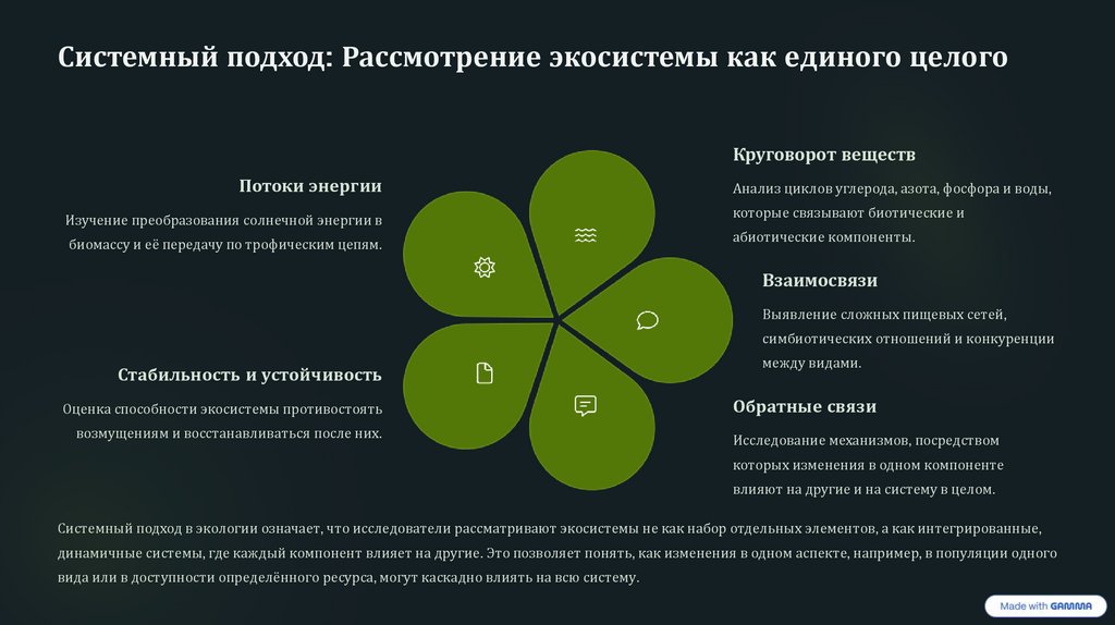 Системный подход в экологии означает, что исследователи рассматривают экосистемы не как набор отдельных элементов, а как интегрированные,