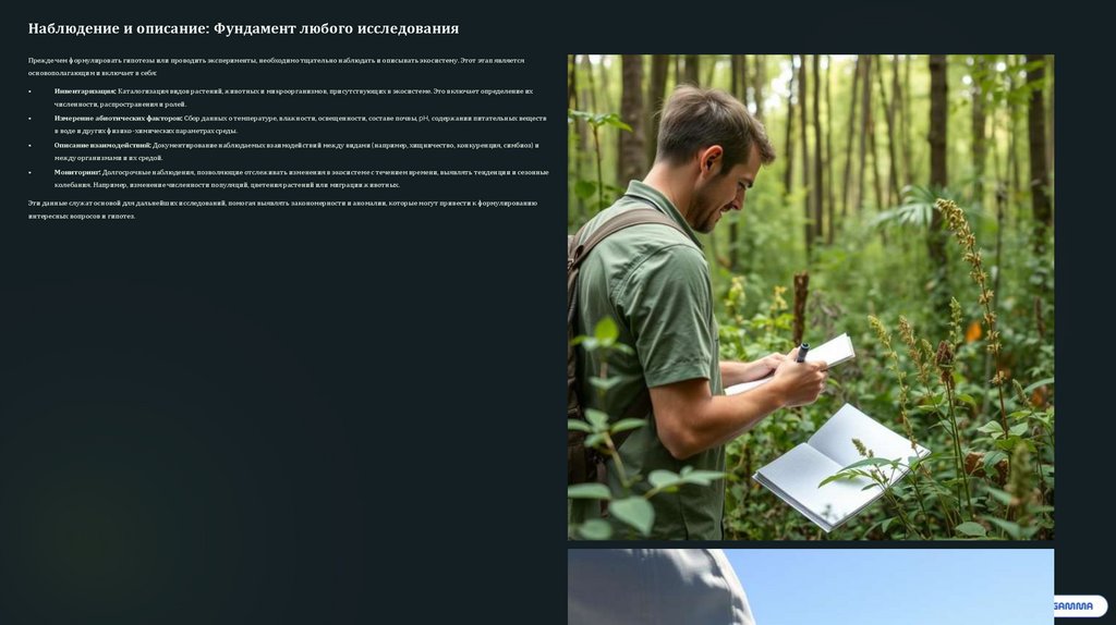 Наблюдение и описание: Фундамент любого исследованияПрежде чем формулировать гипотезы или проводить эксперименты, необходимо тщательно наблюдать и описывать экосистему. Этот этап является