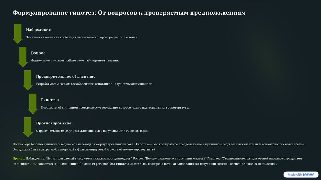 После сбора базовых данных исследователи переходят к формулированию гипотез. Гипотеза — это проверяемое предположение о причинно-следственных связях или закономерностях в экосистеме.