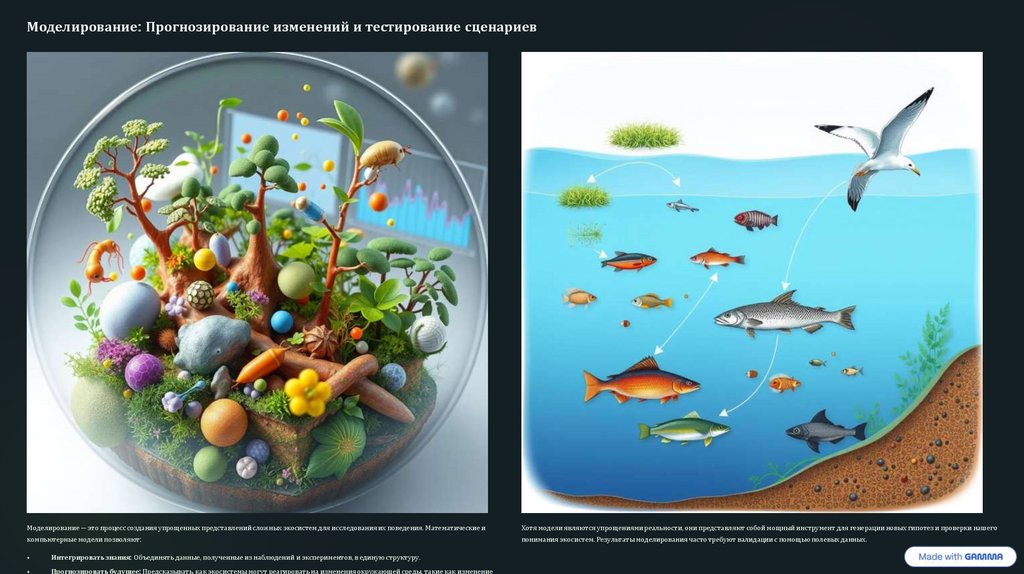 Моделирование: Прогнозирование изменений и тестирование сценариевМоделирование — это процесс создания упрощенных представлений сложных экосистем для исследования их поведения. Математические и