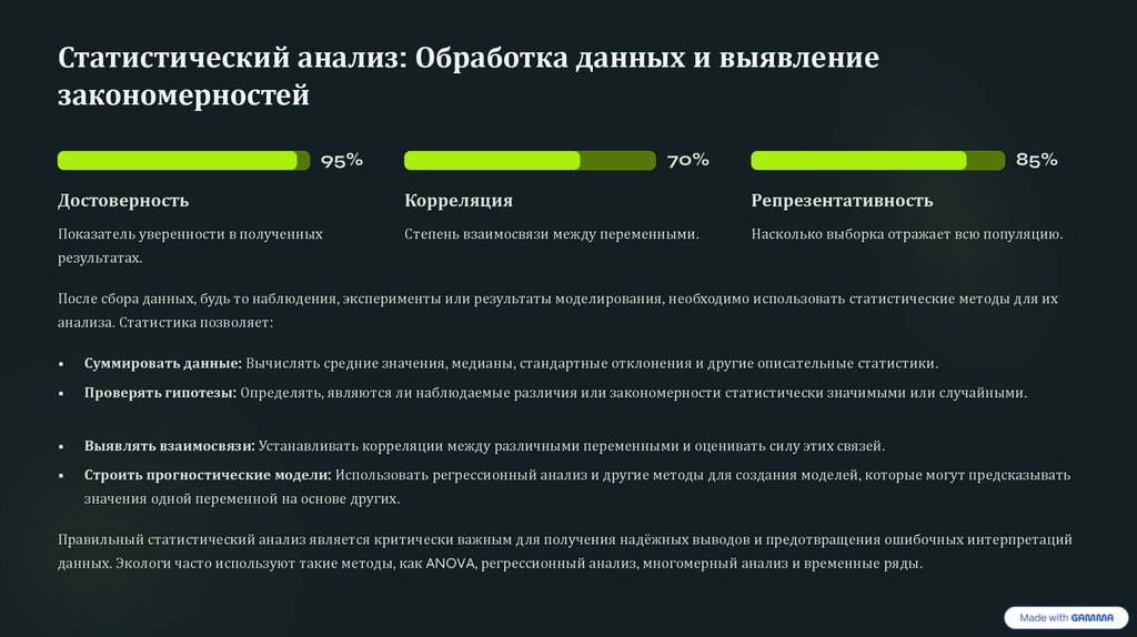 данных. Экологи часто используют такие методы, как ANOVA, регрессионный анализ, многомерный анализ и временные ряды.