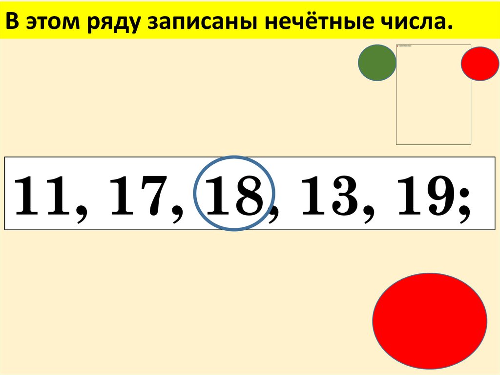 В этом ряду записаны нечётные числа.11, 17, 18, 13, 19;