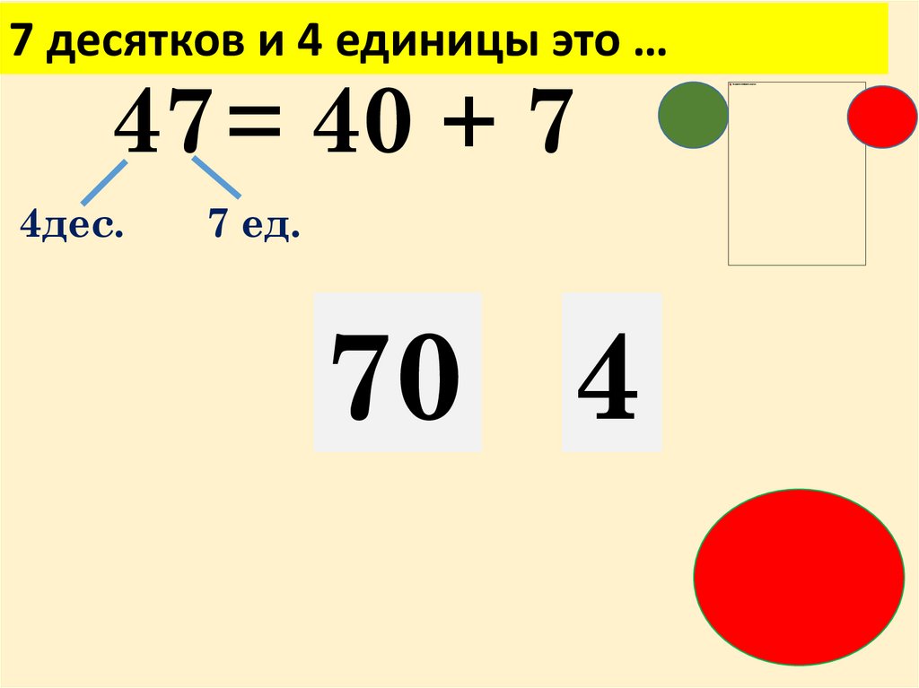 7 десятков и 4 единицы это …47 = 40 + 7