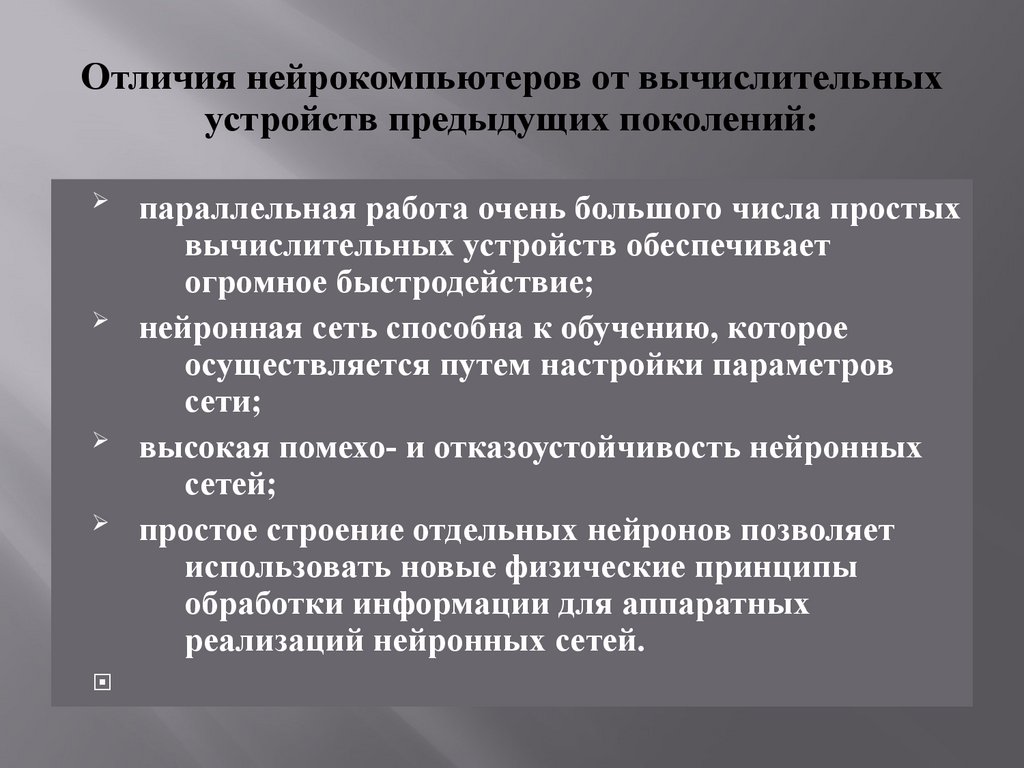 Отличия нейрокомпьютеров от вычислительныхустройств предыдущих поколений: