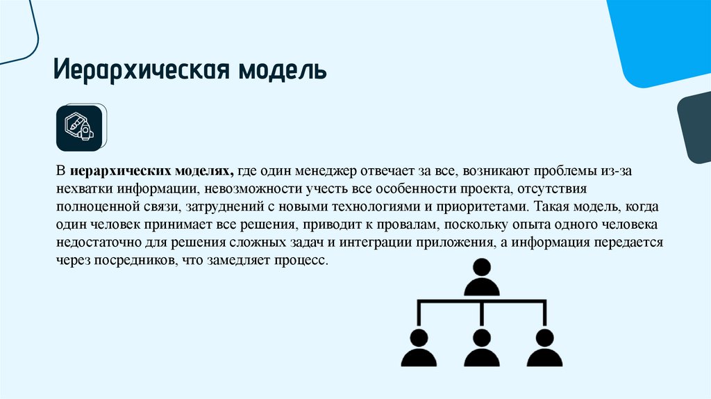 Иерархическая модельВ иерархических моделях, где один менеджер отвечает за все, возникают проблемы из-за