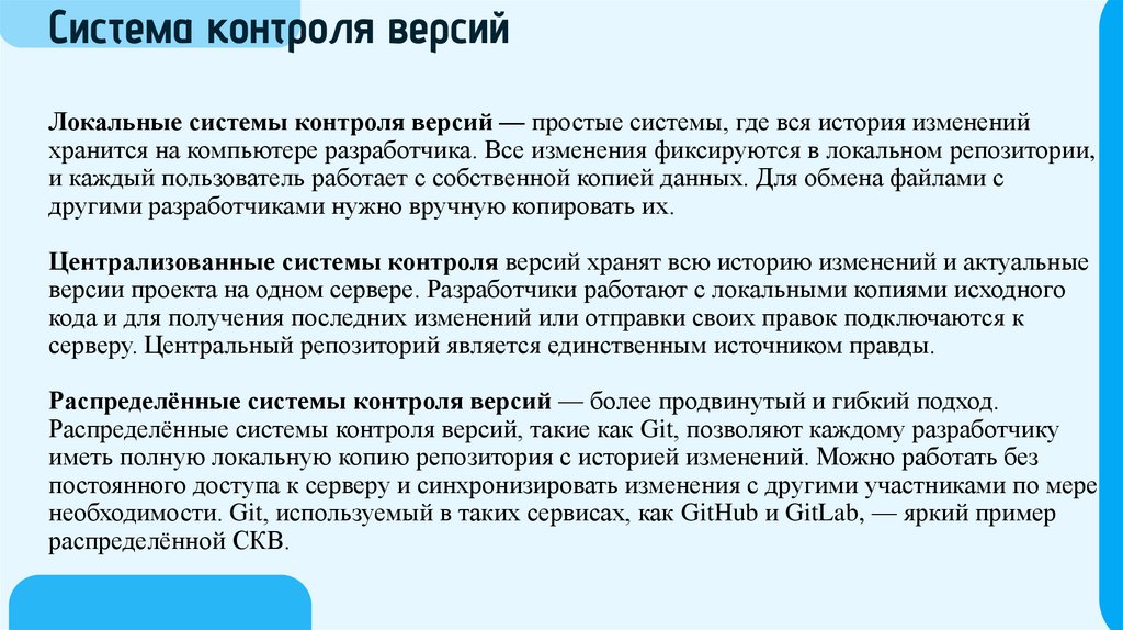 Распределённые системы контроля версий, такие как Git, позволяют каждому разработчику