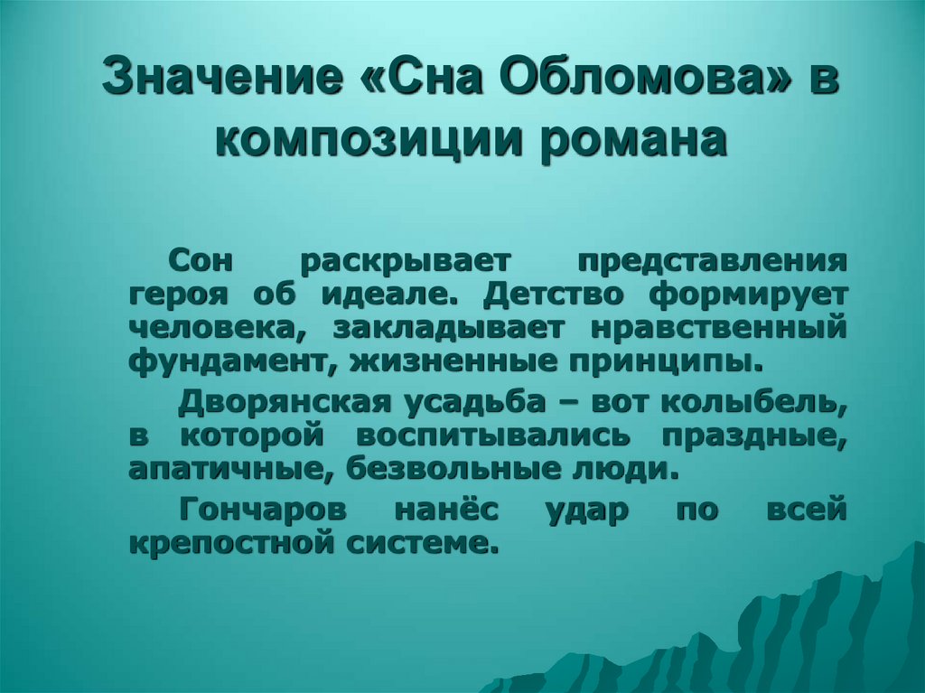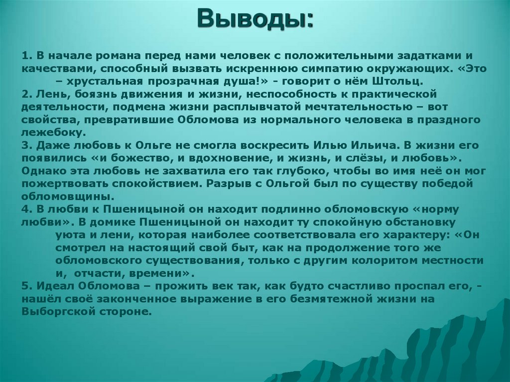 5. Идеал Обломова – прожить век так, как будто счастливо проспал его, нашёл своё законченное выражение в его безмятежной жизни на