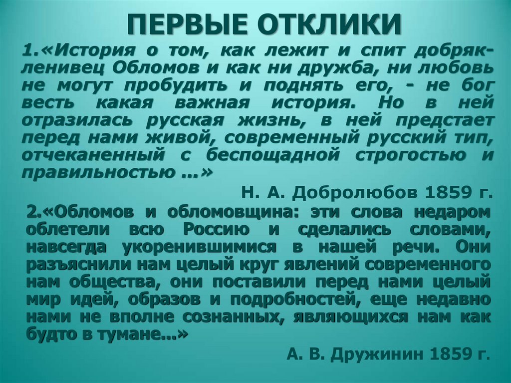 ПЕРВЫЕ ОТКЛИКИ1.«История о том, как лежит и спит добрякленивец Обломов и как ни дружба, ни любовь