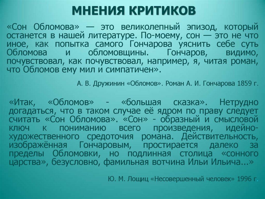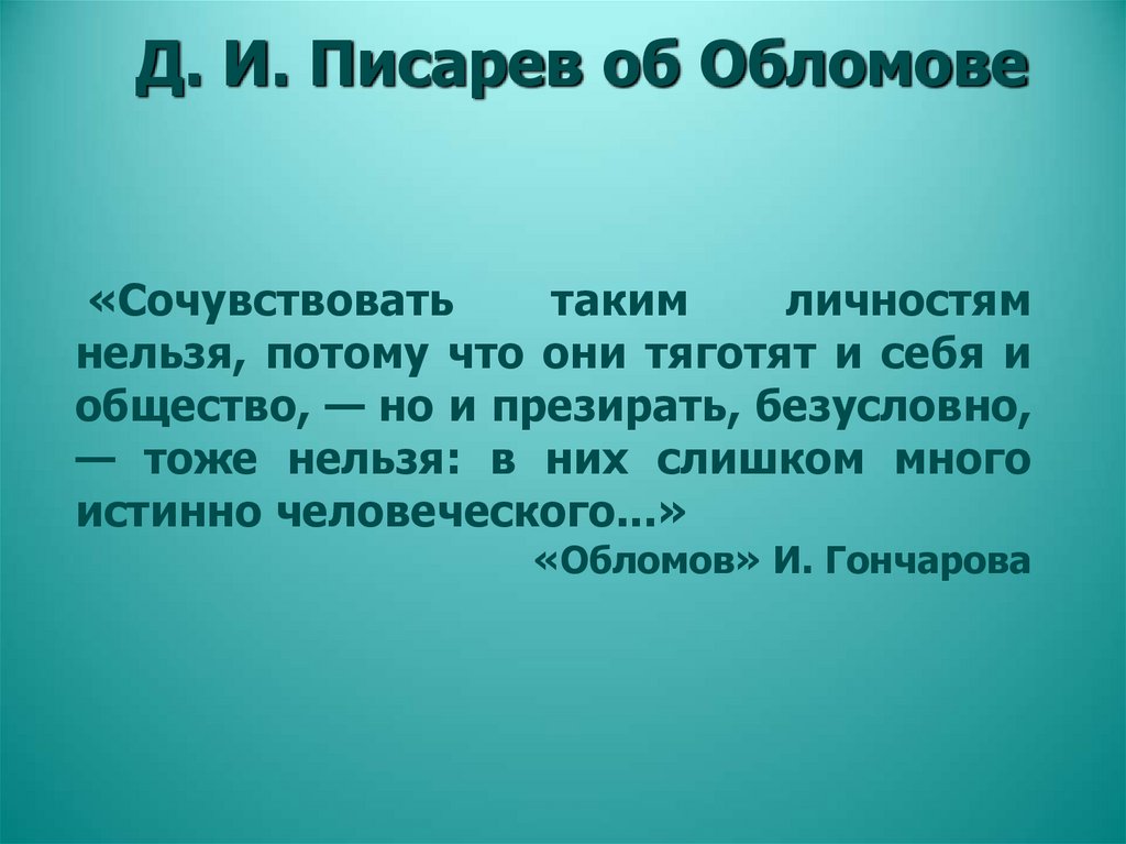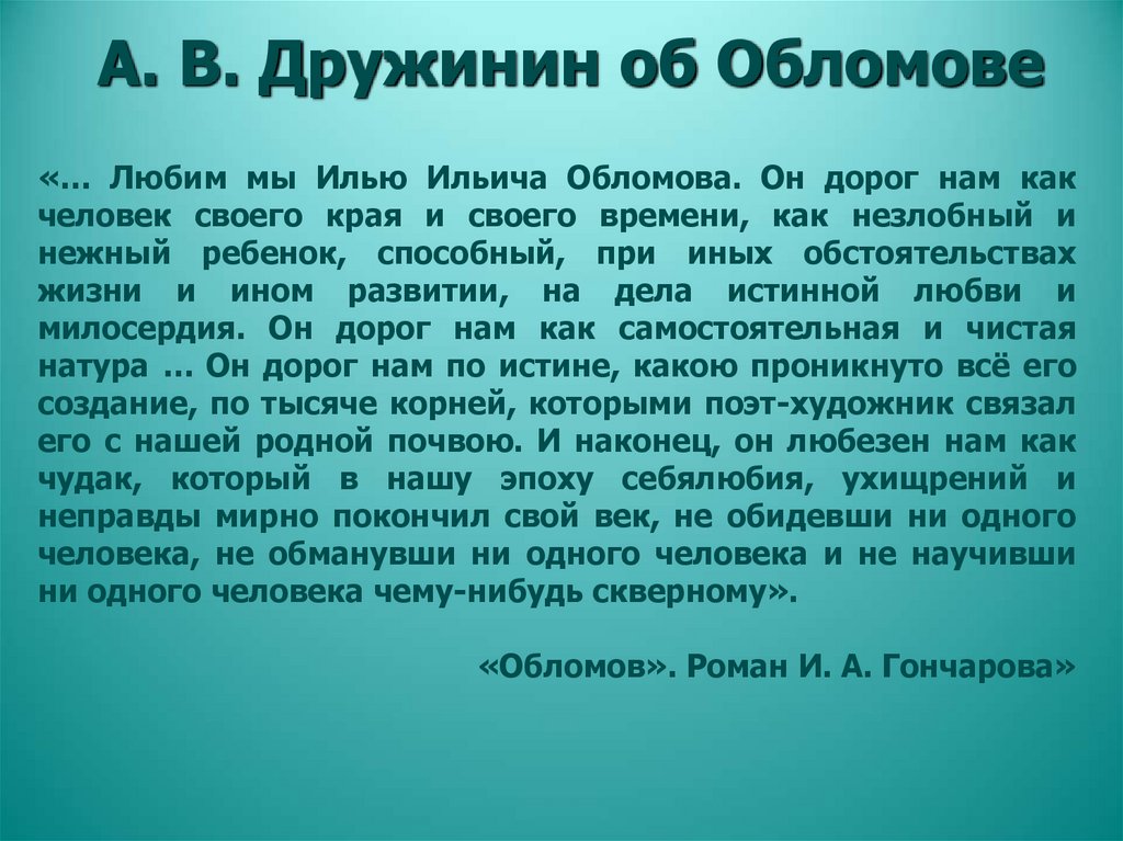 А. В. Дружинин об Обломове«… Любим мы Илью Ильича Обломова. Он дорог нам как