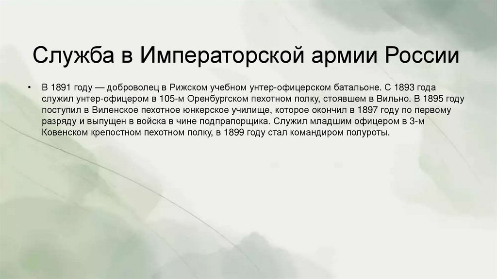 Служба в Императорской армии РоссииВ 1891 году — доброволец в Рижском учебном унтер-офицерском батальоне. С 1893 года