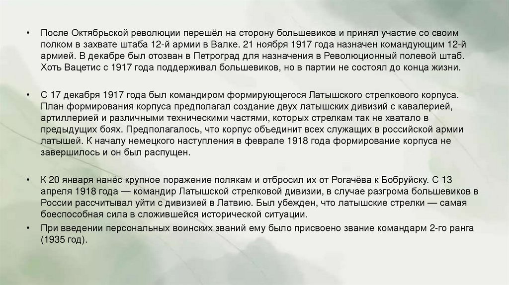 апреля 1918 года — командир Латышской стрелковой дивизии, в случае разгрома большевиков в