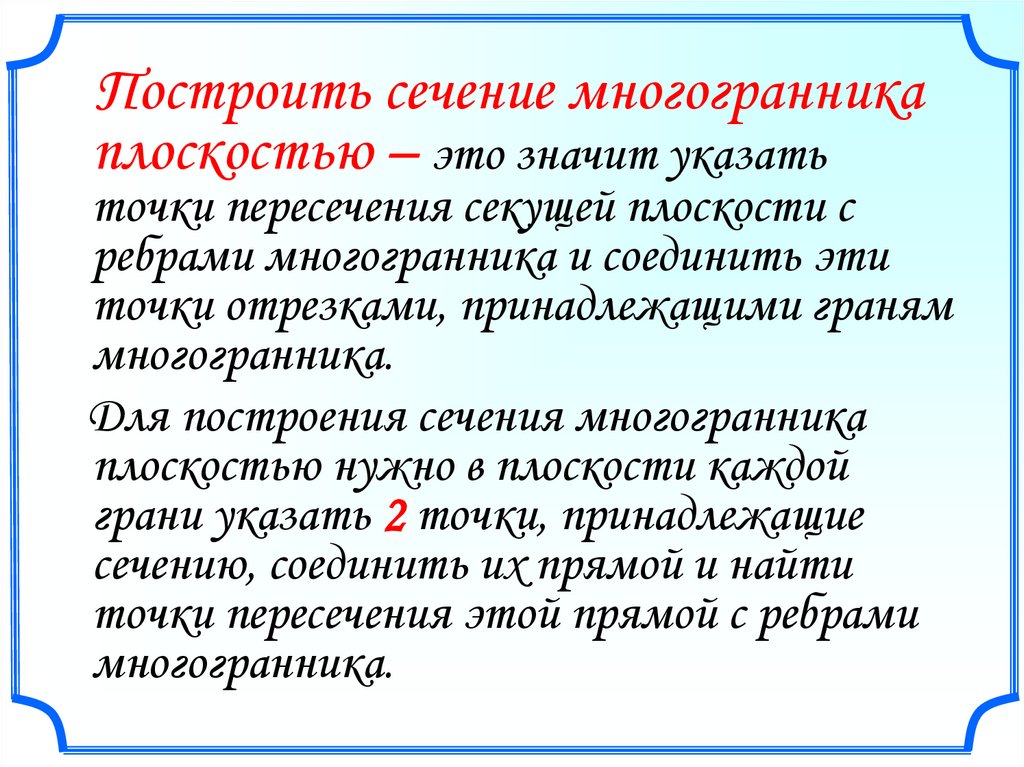 Построить сечение многогранникаплоскостью – это значит указать
