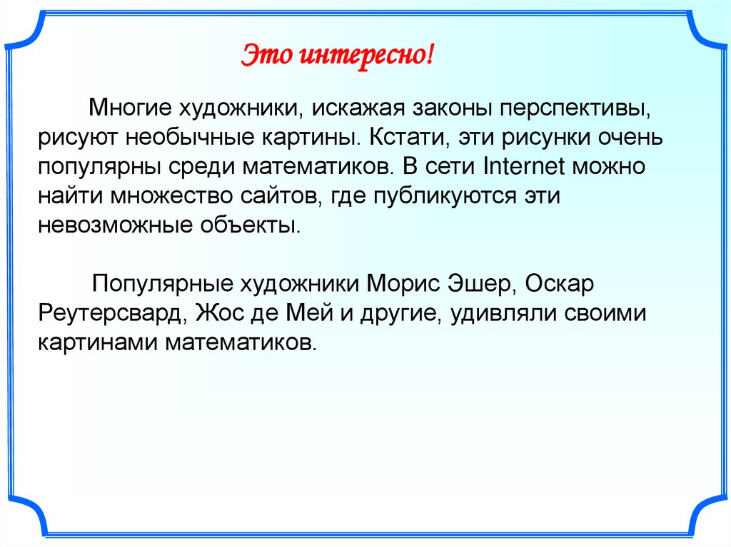 Это интересно!Многие художники, искажая законы перспективы,