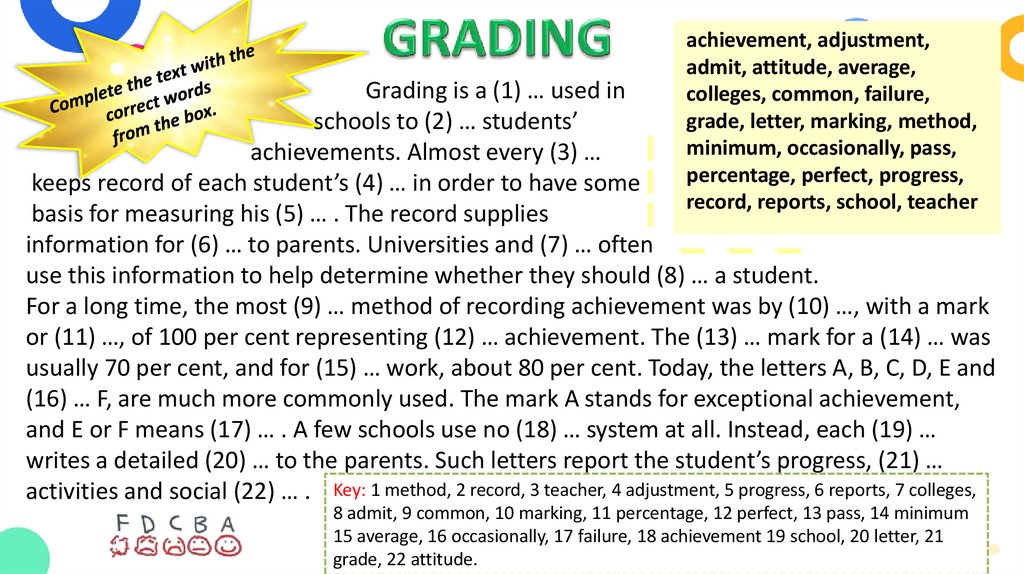activities and social (22) … . Key: 1 method, 2 record, 3 teacher, 4 adjustment, 5 progress, 6 reports, 7 colleges,