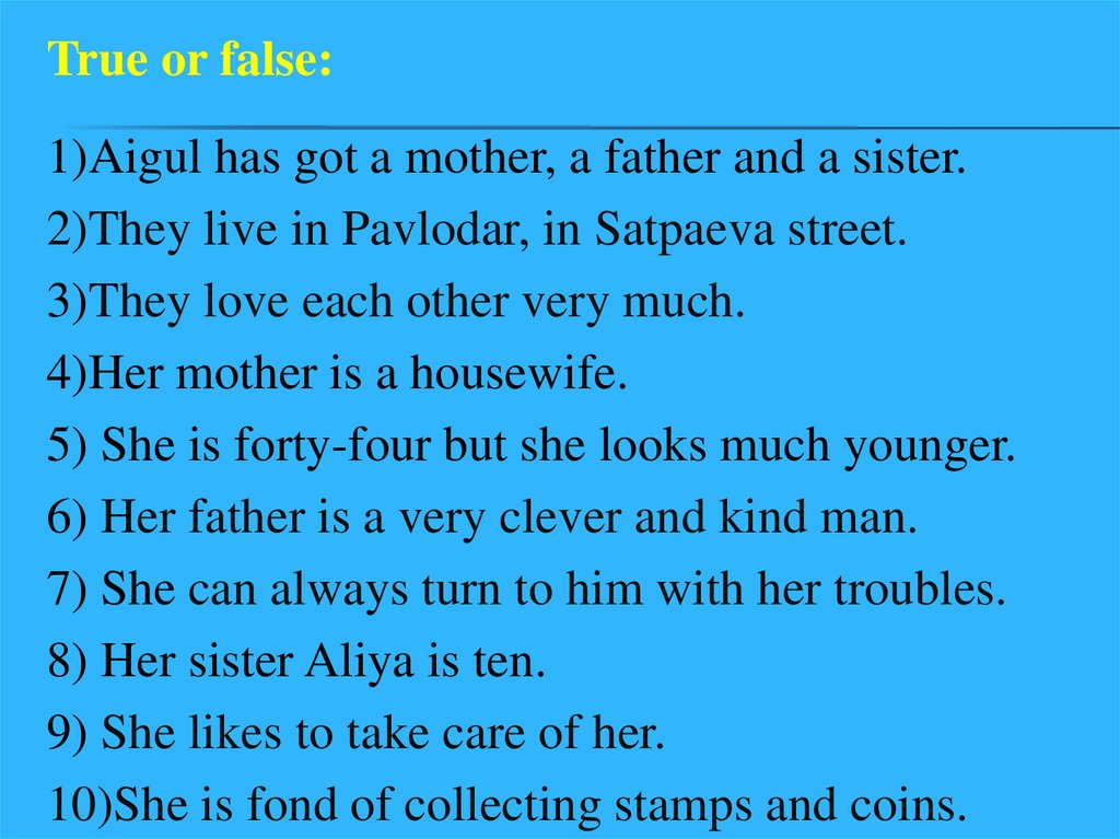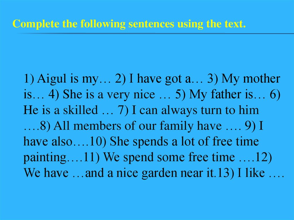 Complete the following sentences using the text.1) Aigul is my… 2) I have got a… 3) My mother