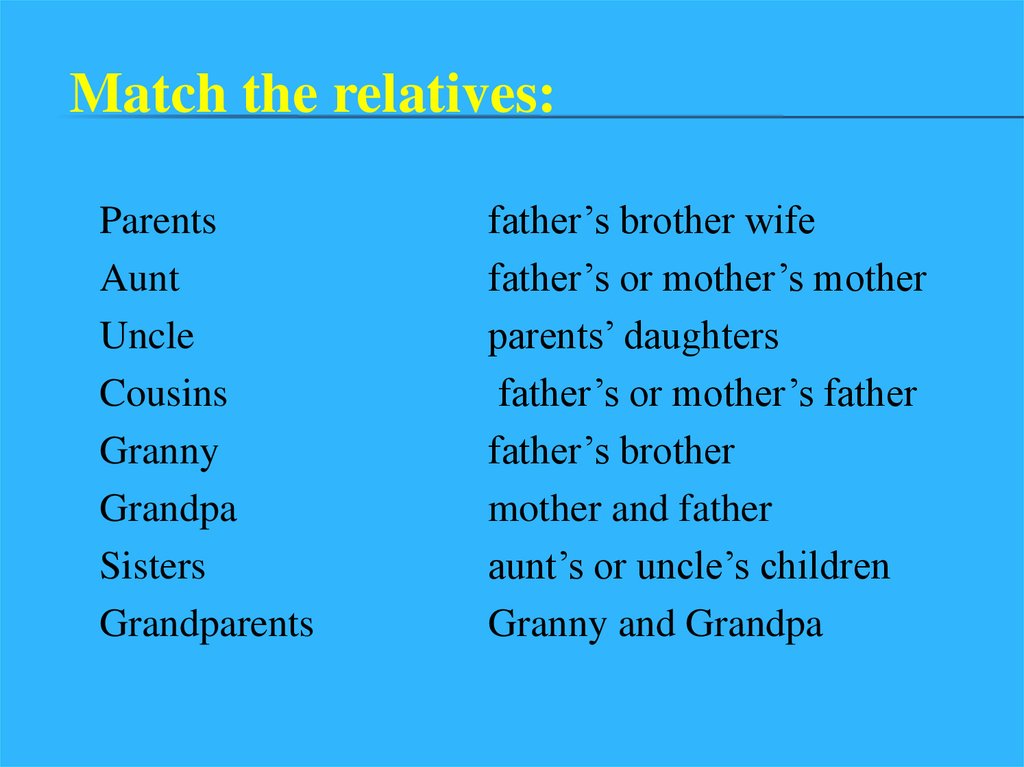 4) My uncle’s son is my … and my aunt’s daughter is my