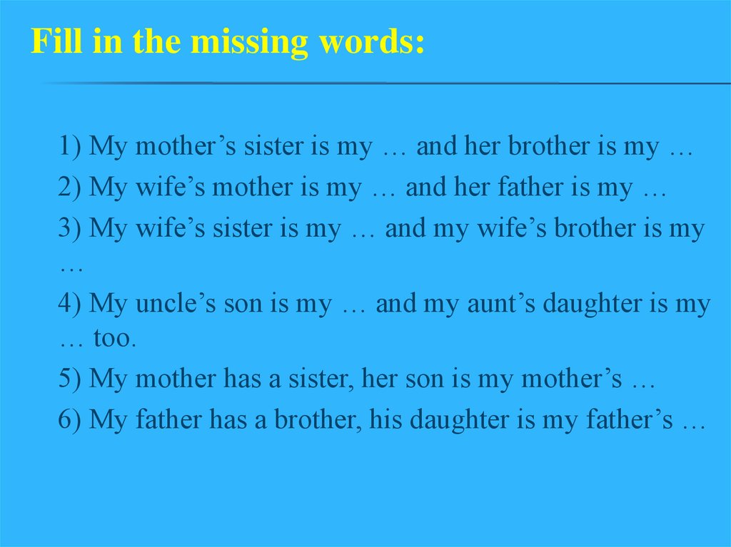 Fill in the missing words:1) My mother’s sister is my … and her brother is my …