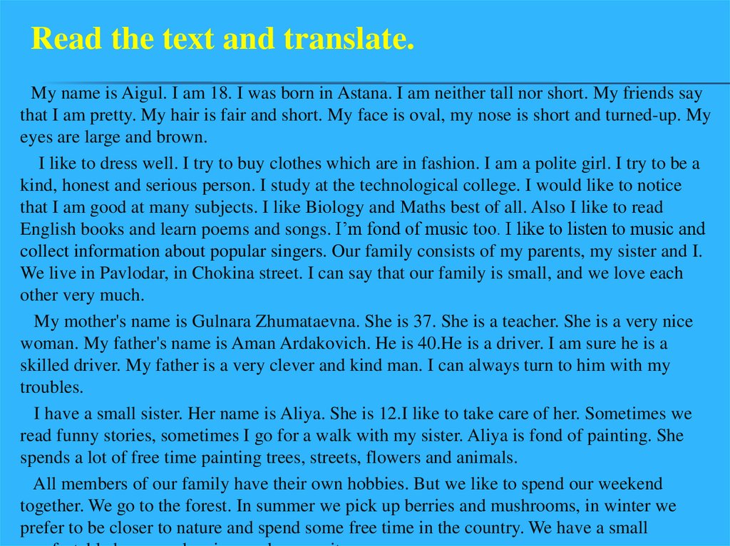 Read the text and translate.My name is Aigul. I am 18. I was born in Astana. I am neither tall nor short. My friends say