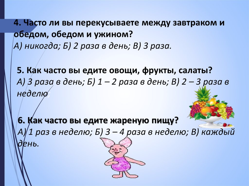 1. Как часто в течение дня вы питаетесь?А) 3 раза и более; Б) 2 раза; В) 1 раз.