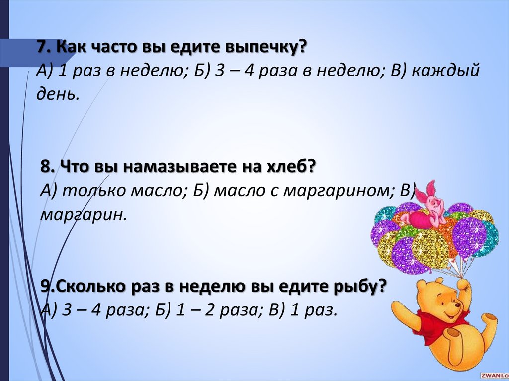 7. Как часто вы едите выпечку?А) 1 раз в неделю; Б) 3 – 4 раза в неделю; В) каждый