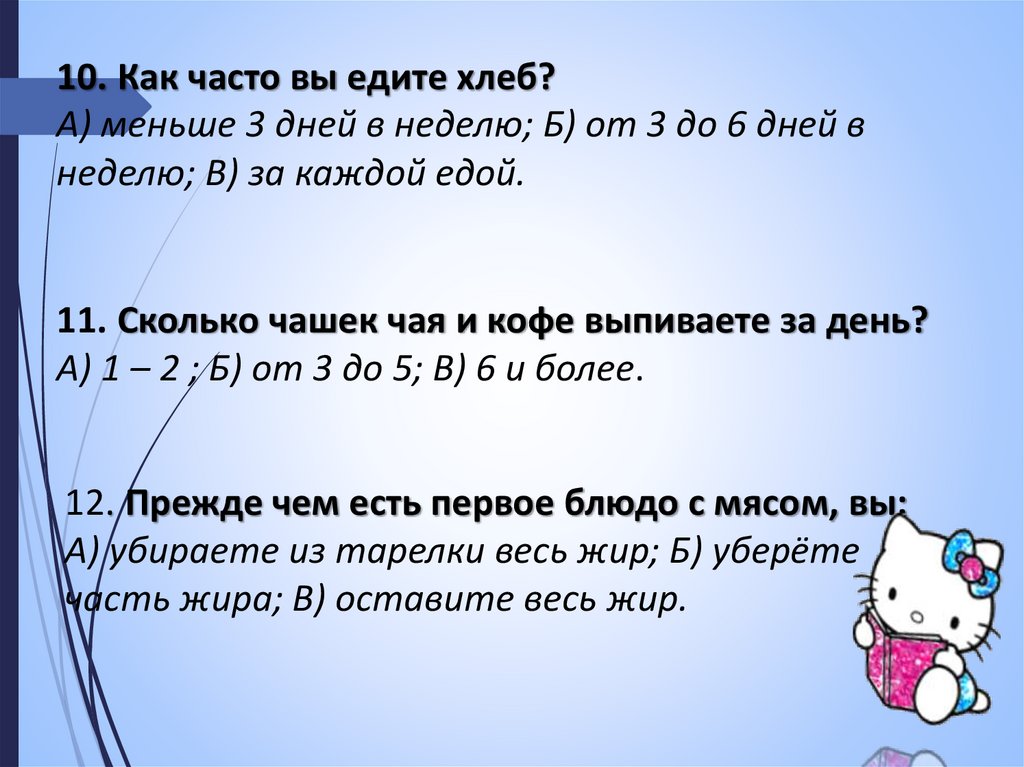 10. Как часто вы едите хлеб?А) меньше 3 дней в неделю; Б) от 3 до 6 дней в