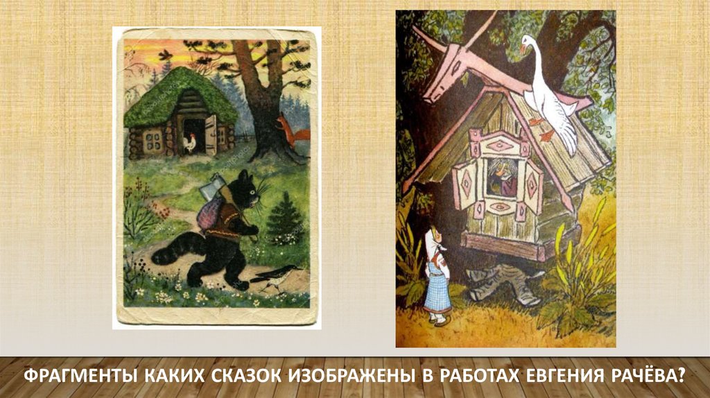 ФРАГМЕНТЫ КАКИХ СКАЗОК ИЗОБРАЖЕНЫ В РАБОТАХ ЕВГЕНИЯ РАЧЁВА?7.