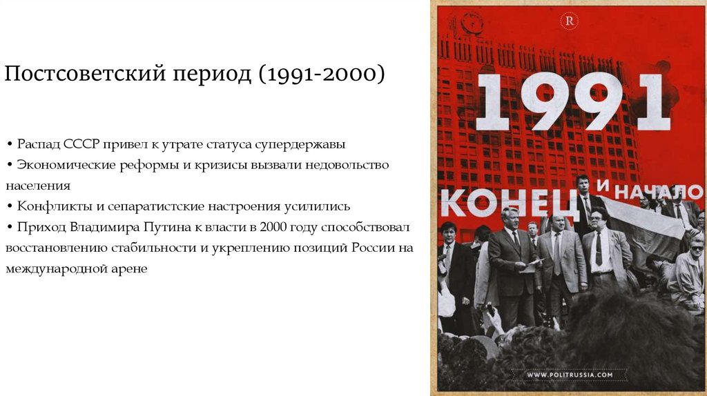 Постсоветский период (1991-2000)• Распад СССР привел к утрате статуса супердержавы