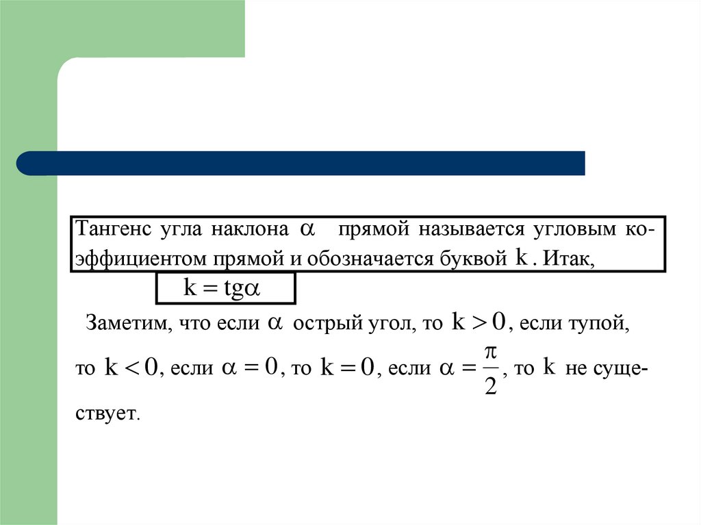 Тангенс угла наклона прямой называется угловым коэффициентом прямой и обозначается буквой k . Итак,k tg