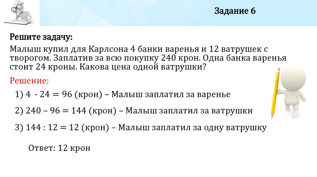 Малыш купил для Карлсона 4 банки варенья и 12 ватрушек с