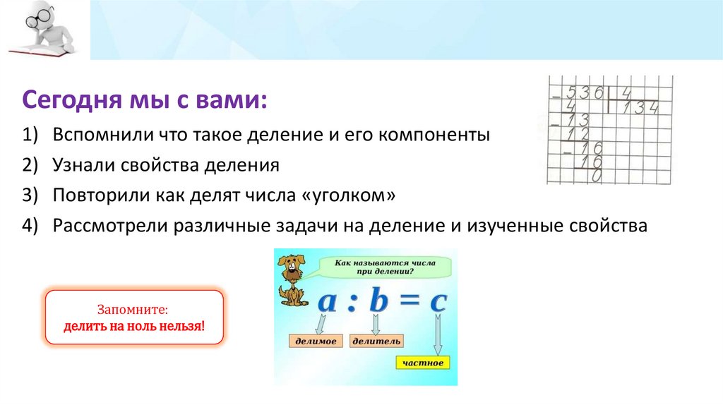 Сегодня мы с вами:1) Вспомнили что такое деление и его компоненты