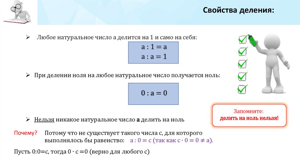 Свойства деления:Любое натуральное число а делится на 1 и само на себя: