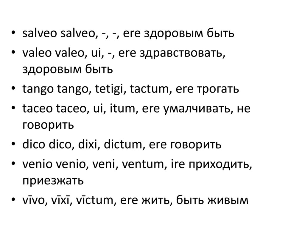 • salveo salveo, -, -, ere здоровым быть• valeo valeo, ui, -, ere здравствовать,