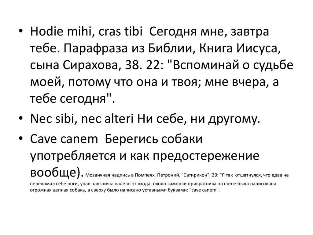 • Hodie mihi, cras tibi Сегодня мне, завтратебе. Парафраза из Библии, Книга Иисуса,