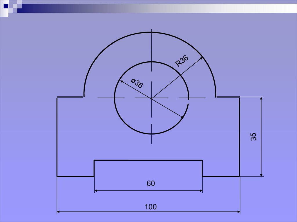 8. Радіуси наносять з позначенням R. Розмірна лінія має лише одну стрілку та проходить через центр дуги.